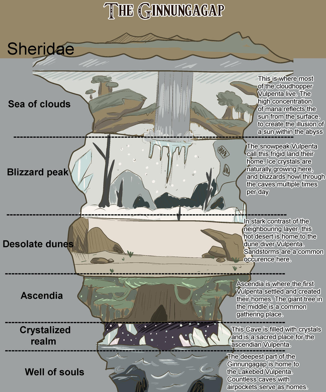 Knowing they could not return to their families under any circumstance, they fled into the Abyss in the middle of the Island of Sheridaea. The Ginnungagap, where they were re-discovered over 100 years later by a research squad - the Delta squad, consisting of 3 Terrox - one of which had turned into a Vulpenta. They explained that it happened due to an attack by a beast with a crystal stinger.